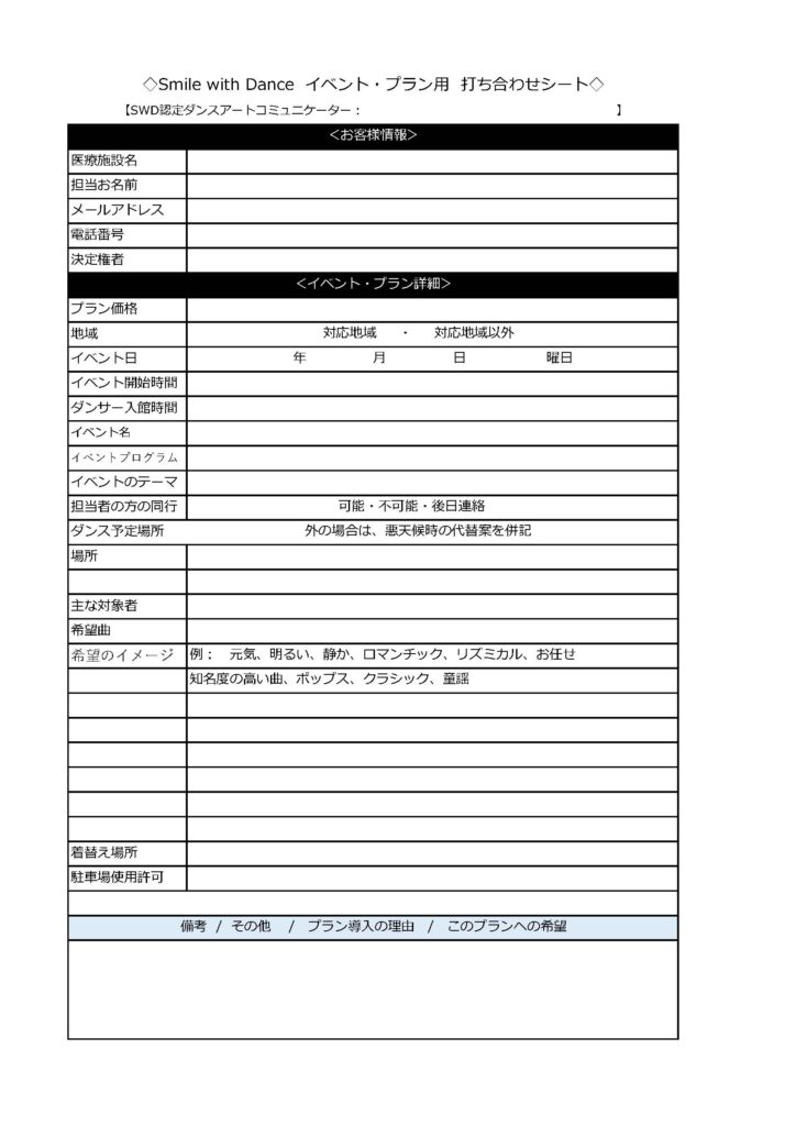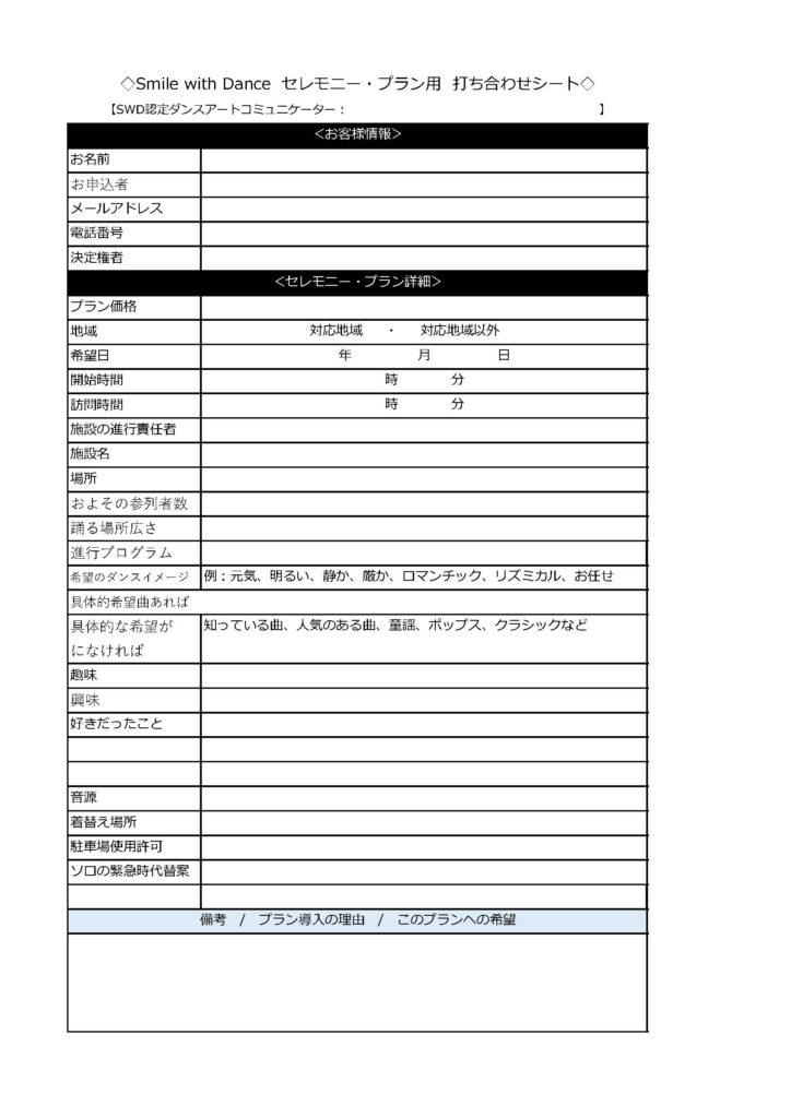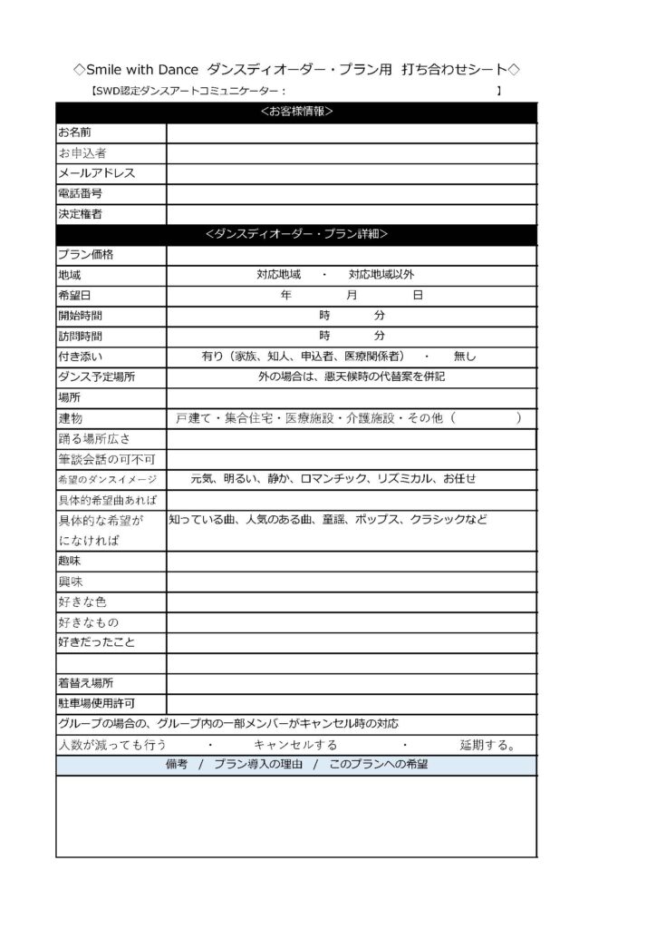 <ダンスディオーダー・プラン>打ち合わせチェックシートのサンプル